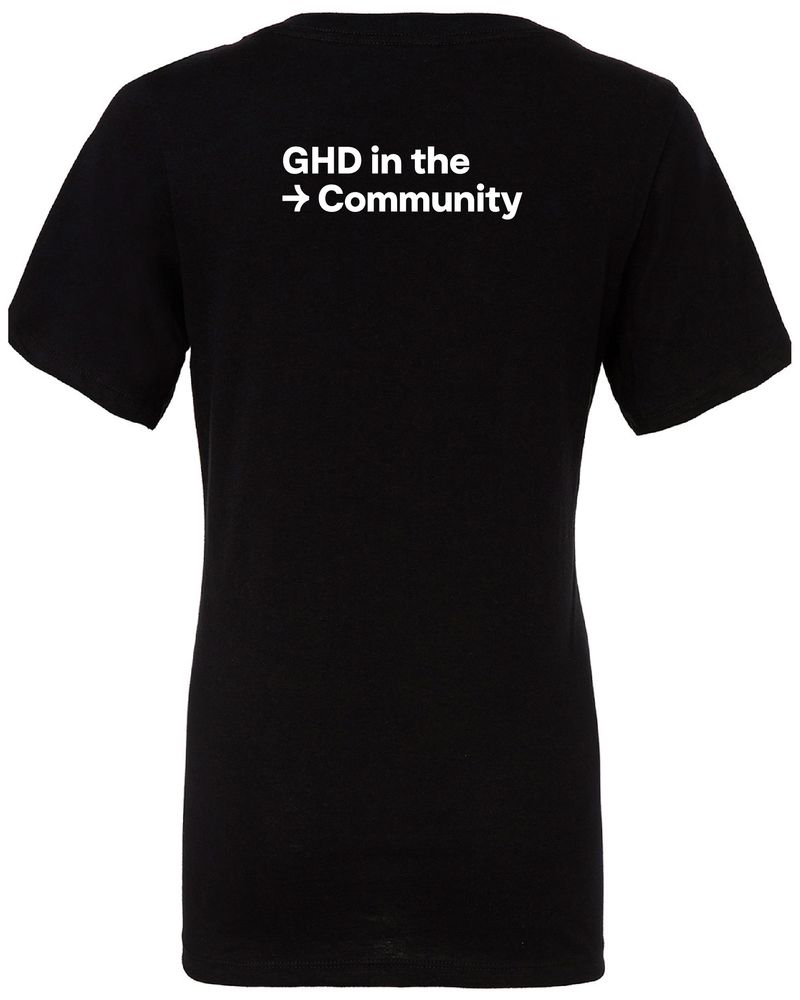 Includes GHD logo on left chest of t-shirt and GHD in the Community centered on upper back of t-shirt.