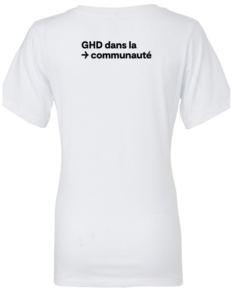 Includes GHD logo on left chest of t-shirt and GHD in the Community centered on upper back of t-shirt.